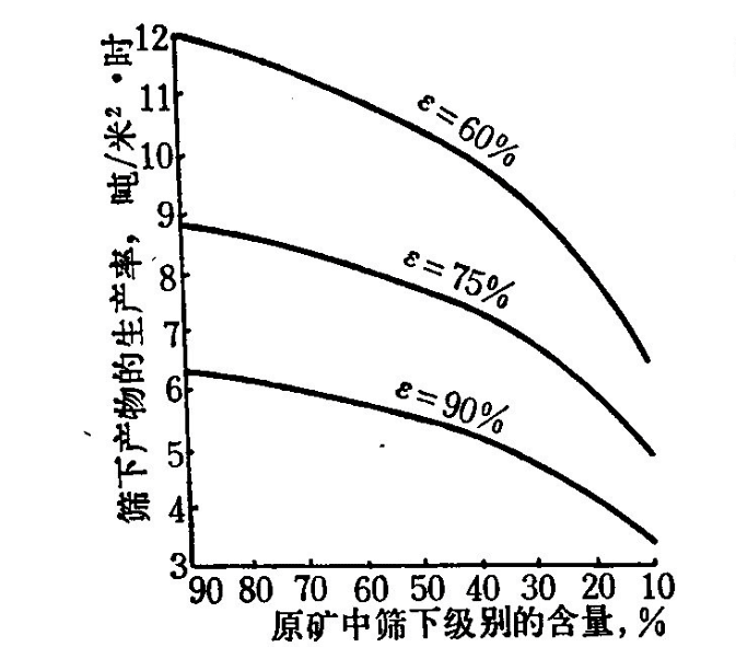 物料的粒度組成對篩分過程有決定性的影響。在任何情況下,細粒總是比粗粒容易通過篩孔。因之,當物料內細級別含量增大時,篩子的生產率(無論按給礦量計算還是按篩下產物計算)也隨之顯著增大。下圖的曲線表示不同篩分效率時生產率(按篩下產物量計算)與原物料內細粒級別含量之間的關系。由圖可以看出,當原物料內篩下級別的含量由10%增加到90%時,篩子的生產率幾乎增大一倍。這是因為當篩下級別含量大的物料給到篩上時,細粒就很容易且迅速通過篩孔,而留在篩上的物料就很少了,這時即使在篩上物料內還有一些"難篩顆粒",相對地比較容易通過篩孔,因為其他的礦粒對它們的影響也小。反之,當原物料內篩下級別含量少時,因為整個篩面幾乎被篩上產物所占據,妨礙了細粒子通過篩孔,因此在保證篩分效率相等的條件下,按給礦量計算的生產率也就降低了。所以當原物料中細級別少,而粗級別的粒度又比篩孔尺寸大得很多的時候,有的生產廠為了提高篩子的生產能力和延長篩網的使用壽命采用雙層篩作單層篩使用。上層篩孔較大的輔助篩網預先排出過粗的級別,然后下層篩對含有大量細級別的較細物料進行最終篩分。