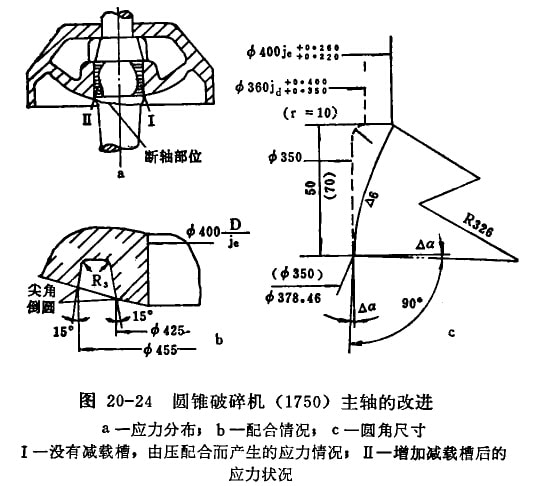 (3)在保證主軸與軀體緊配合,運轉(zhuǎn)中不發(fā)生松動的情況下,減小主軸與圓錐軀體的配合過盈,以適當(dāng)緩和應(yīng)力集中。例如舊系列φ1650主軸用D/Jd配合;新系列φ1750破碎機改為D/j配合(圖20-24b)。