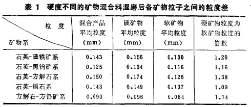 大量的實驗研究結果證實,不同硬度礦物的混合礦料磨碎 時,產物中各種礦物粒子之間存在著明顯的粒度差。用多種純礦物混合料在不連續磨機中濕磨后所得到的產物中,硬度不同的礦 物粒于的加權算術平均粒度值及軟硬礦物的拉度關如表l所列。