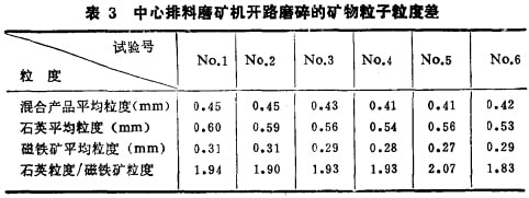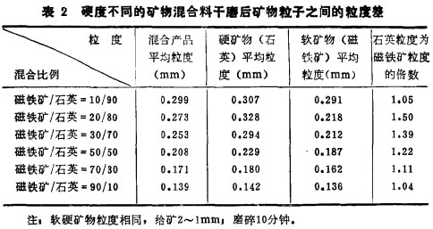 用磁鐵礦與石英按不同比例混合并在不連續磨機中進行干磨后,所得產品中仍然存在軟(磁鐵礦)硬(石英)礦物粒子的粒度差,其加權算術平均值列于表2。