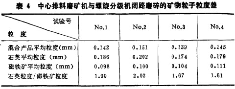 表3為中心排料磨礦機開路磨礦結果,表4為中心排料磨礦機與螺旋分級機閉路磨礦結果。由表3、4可見,在連續磨礦條件下,硬度不同的純礦物混合物磨碎后仍然存在粒度差。