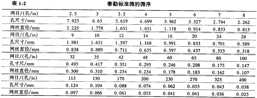 我國通常采用泰勒標準篩,其篩孔大小用網目來表示。網目是指一英寸長度內(lin=25.4mm)所具有的篩孔數目。網目越多篩孔越小。這種篩子是以200目(篩孔寬為0.074mm)作為基本篩,篩孔由上到下逐漸減小,構成篩序。兩個相鄰篩子的篩孔尺寸之比稱為篩比,泰勒標準篩有兩個篩比,即基本篩比和補充篩比。補充篩比即在篩比為√2的基本篩序戶間又插入一套篩比為√2的附加篩序構成。篩孔尺寸可根據篩比計算。例如計算基本篩的—卜一基本篩序為150目的篩子篩孔尺寸時,用基本篩的篩孔乘以基本篩比確定,即0.074x√2=0.104mm。若計算兩篩之間的補充篩篩孔尺寸,則用基本篩的篩孔尺寸乘以補充篩比得到,即0.074x4√2=0.088mm。泰勒標準篩的篩序列于表1-2中。