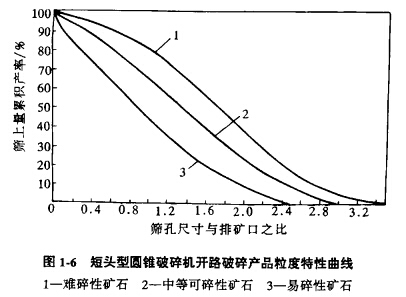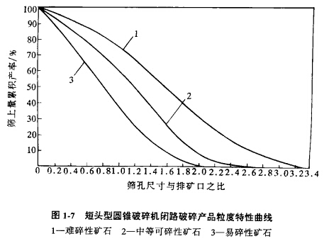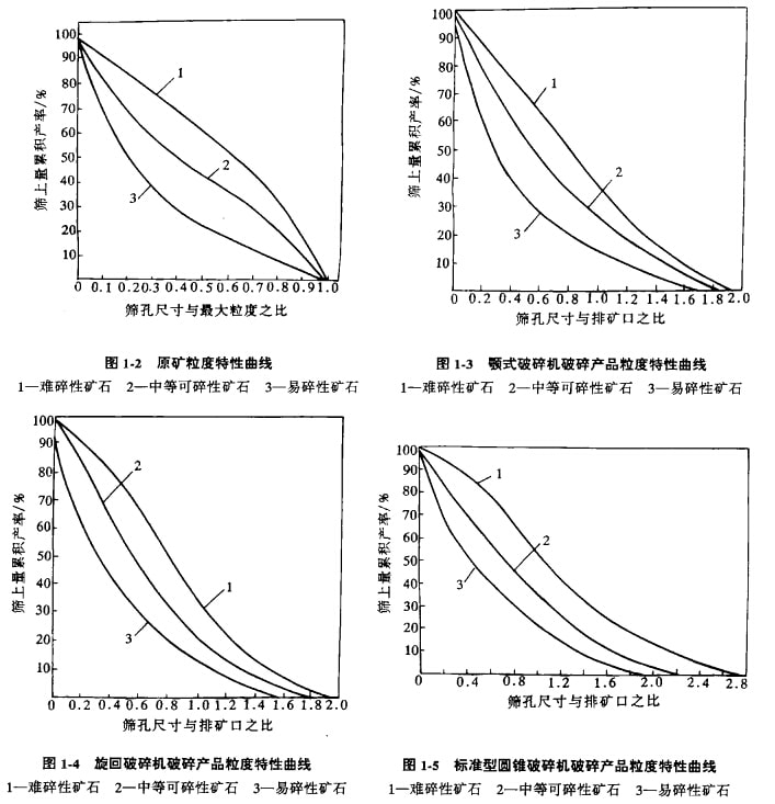 如圖1-2—圖l-7所示,從粒度特性曲線圖中看出,難碎性礦石的粒度特性曲線1都是凸形曲線,這表明礦石中粒度較大的粒級占的質量百分數較大;中等可碎性礦石的粒度特性曲線2都近似于直線,這表明礦石中各種粒級所占質量的百分數大致相等;易碎性礦石的粒度特性曲線3都是凹形曲線,這表明該礦石中細粒級所占質量的百分數比較大。根據粒度特性曲線,可比較各種礦石的破碎難易程度,檢查破碎機械的工作情況,比較各種破碎機的破碎效果。