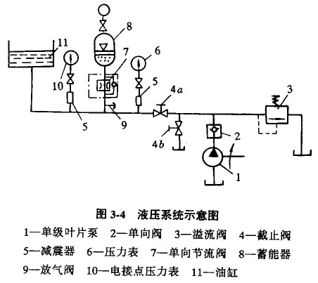 液壓系統(tǒng)由單級(jí)葉片泵I、單向閥2、溢流閥3、截止閥4、單向節(jié)流閥7和蓄能器8等組成。如圖3-4所示。蓄能器起保險(xiǎn)作用,內(nèi)部充氣壓力一般為1.1MPa。單向節(jié)流閥起過(guò)鐵時(shí)動(dòng)作快,復(fù)位時(shí)動(dòng)作慢的作用,以減輕復(fù)憤時(shí)對(duì)破碎機(jī)的強(qiáng)烈沖擊。