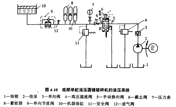 非破碎物排出后,氣體壓力又高于油壓,則進入蓄能器內的油又被壓回伯缸,使破碎錐恢復正常工作位置。這種破碎機的液壓系統如圖4-10所示。