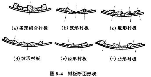 磨機襯板的結(jié)構形式及互相間的安放位置,都直接影響著磨機的工作效率。磨機襯板的厚度范圍為50mm-150mm,其結(jié)構形式和尺寸,須按磨帆的用途和工作特點,并適當考慮制造、安裝和搬運方便的原則來選取c為保證磨機生產(chǎn)的穩(wěn)定性,要求磨機襯板在被磨損到一定積度時,仍能較好地保持原有的結(jié)構特性。如圖8-4所示,為常用的幾種磨機襯板的形式。