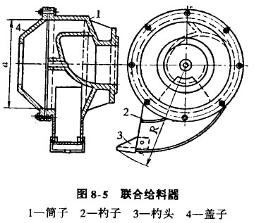 給料部:給料部的作用是將被磨物料相分級返砂迅速給入磨機中。給料部是由帶中空軸頸的端蓋7、聯(lián)合給料器8、扇形襯板9和軸頸內(nèi)套10等組成。端蓋內(nèi)表面上敷有扇形錳鋼襯板9,各襯板之間留有一定間隙頸(約15mm),以便于安裝和拆卸,襯板用螺釘直接固定在端蓋上。中空軸頸內(nèi)銷有一個內(nèi)表面帶螺旋葉片(也有不帶螺旋葉片的內(nèi)套,主要根據(jù)巾空軸頸粗細而定)的鑄造內(nèi)套,它們中間墊著襯墊,內(nèi)套保護中空軸頸不受磨損,螺旋葉片隨筒體旋轉(zhuǎn)而把料送入筒內(nèi),為了防止內(nèi)套與筒體相對轉(zhuǎn)動,用螺釘把它固定在中空軸頸的端部,給料器8(如圖8-5所示)則用螺釘固定在內(nèi)套的端面上。