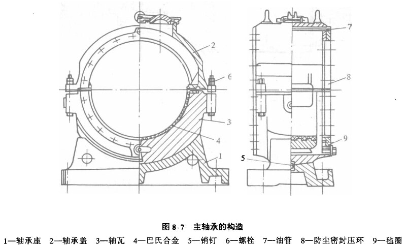 潤滑油由集中潤滑系統(tǒng)以一定的壓力進入軸承蓋上方的油管7中,油管7上有哨油孔,潤滑油由噴油孔噴注到個空軸頸的外表面上,潤滑后流集在下軸瓦的油槽內(nèi),從排油管流回油箱。為廠防止灰塵從軸頸與軸承間的間隙進入軸承,在主軸承的端面放毛氈密封圈,并用由兩半拼成的密封環(huán)9固定住。
