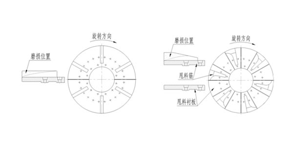 老型PFL的甩料盤結構如圖1所示:由于甩料盤的筋靠近圓周邊緣的切線速度比內側要高、磨損要快,材料利用率很低(不足10%),甩料盤筋的形狀和磨損位置如圖1所示。