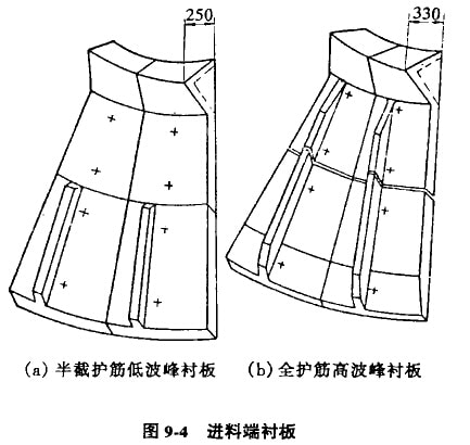 濕式自磨機筒體內表面襯有七種不同形狀的襯板。進料端襯板如圖9-4所示,它直接受到剛入磨機的大塊物料的沖擊,同時又受到回轉運動物料的磨損,因此,它的損耗是很快的。為了避免物料沖擊板面,則在襯板靠近中心的一端,設有250mm高的波峰。為了避免物料環向運動的磨損,則在外圈襯板上設有80x80mm截面的護筋。實踐證明,波峰高增加到330mm,并在內圈上也增加了護筋,其壽命可延長2-2.5倍。