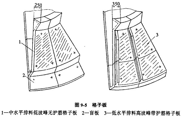 格子板如圖9-5所示;它在自磨機中不單是起排料的作用,同時還起到篩分作用;因此,格孔所處的位逞和孔隙大小都要選擇適當。格子板可分為高水平排料、中水平排料和低水平排料三種。在物料充填率45%左右的情況下,用中水平排料位貴,即可滿足排料要求,但自磨機往往會出現較低充填率(低于20%)的情況,就有排不出料的可能。護筋和波峰板在格子板有同樣的作用。