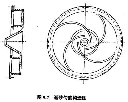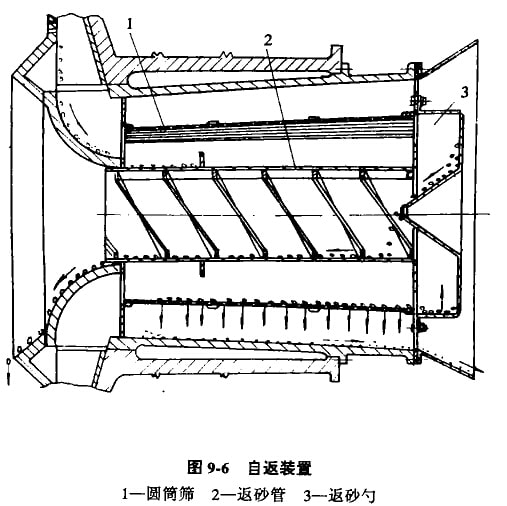 料漿通過格子板孔之后,被簸箕板送入自返裝置的篩上,大塊物料在篩面上運動到另一端的返砂勺內。在返砂勺的回轉運動中,送入返砂管內。返砂管內的螺旋片,將大塊物料推送到磨機之內再磨。篩下物沿著出料襯套排出機外,進行下道工序處理。返砂勺的構造如圖9-7所示。