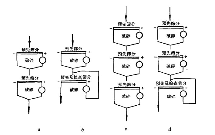小型選礦廠常采用二段開路破種流程(圖1a),第一段一般可不設(shè)預(yù)先篩分。中小型選礦廠常用二段一次閉路破嬸流程(圖1b)成二段 —次閉路破碎流程(圖1d)。大型選礦廠常用三段開路破碎流程(圖lc)或三段一次閉路破碎她程(團(tuán)1d)。在處理含水分較高的泥質(zhì)礦 石及易產(chǎn)生大量石英礦塵的礦石時,以采用開路破碎流程為宜,因采用閉路破碎時,易使篩網(wǎng)及破碎機堵塞,或產(chǎn)生很多有害礦塵。