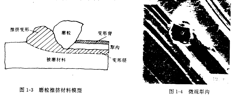 如果磨粒不夠尖銳,或刺入材料表面角度不適合切削,則會將材料表面擠出犁溝。犁溝變形有兩種:一種是由于磨粒推擠材料,使之堆積在廟版運動的前方,當堆積增高后就會阻礙磨粒運動直到磨粒破碎,或被其他磨粒破碎帶走。第二種是磨粒將材料擠向溝槽兩側(也可能擠向一側),圖l-3所示為帶有負前角的磨版推擠材料的模型。圖1-4是磨粒推擠材料形成犁溝的過程照片。磨粒犁溝材料表面并不能一次產生磨屑,而是當第一個磨粒推擠材料表面形成犁詢后,已經使溝榴底部或溝槽兩側金屆發生—“定程度的塑性變形,后繼的磨粒可能切削金屬或繼續推擠已經發生理性交形的犁溝構底或兩側,當磨粒多次使金屬變形且變形程度超過材料允許的延伸極限后,變形材料表面就會產生裂紋,裂紋擴展,形成薄片狀磨屑,這一磨損過程被稱為微觀犁溝(圖1-4)。