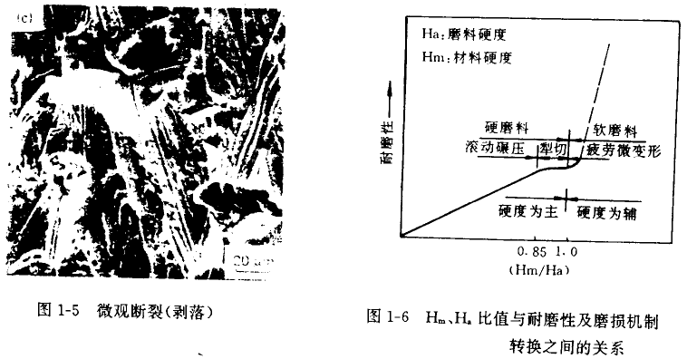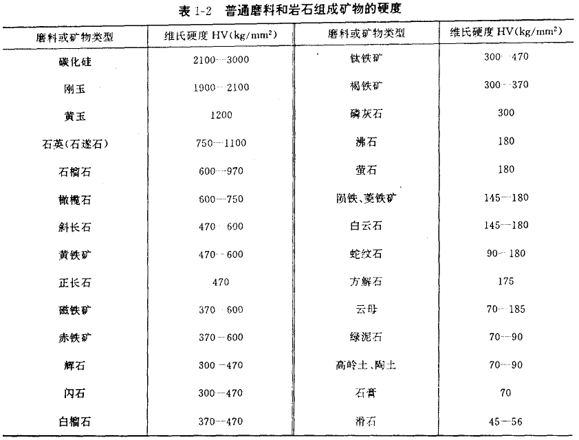 由此可見,當磨料硬度遠遠大于材料硬度時,磨損嚴重,磨損與材料硬度無關;當材料硬度接近于磨料硬度時,隨比值的增大,磨 損急劇減小。應該指出的是,即使是很軟的磨料,由于沖擊作用或者其中滲有硬磨料等因素,也會導致工件的磨損。因為實際磨料的硬 度和材料硬度都不是一個單一的數值而是一個分布值(見圖1-8)。因而,即使工件的平均硬度值超過磨料的平均硬度值,由于磨料與 材料硬度的統計分布關系也會引起磨損。這就說明了為什么煤炭的硬度不高,但對煤炭機械造成的磨損仍然是十分嚴重的事實。表1-2 表示了各種磨料類型及巖石硬度值。