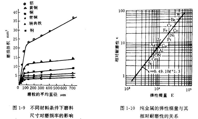 磨料的尺寸粒度對磨損也有一定的影響(見圖1-9)。當磨料在某一臨界尺寸以下時,體積磨損隨磨料尺寸的增加而急劇地按比例增加 ;當超過一臨界尺寸后,磨損增大的幅度顯著降低。