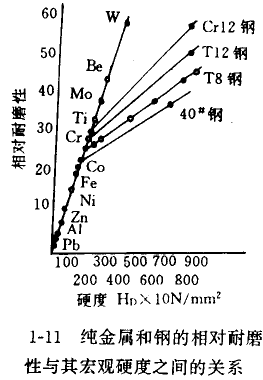 工業純金屬的耐磨性與其彈性模量成正比(見圖1-10)。但這種關系不適用于熱處理過的鋼材,雖然熱處理不改變材料的彈性模量, 但都會使其耐磨性大大提高。相反,工業純金屬和不同類型鋼相對耐磨性與其宏觀硬度成正比(見圖1-11)。熱處理前后鋼的相對耐磨性 單值地決定于其宏觀硬度,只不過隨其宏觀硬度增高其耐磨性變化斜率不同而已。耐磨性不僅取決于鋼的硬度、而且取決于它們的成分 ,不同成分的鋼熱處理后雖然具有相同的硬度,但其耐磨性卻不同,這說明各種鋼的耐磨性與其宏觀硬度間并不存在單值的對應關系。