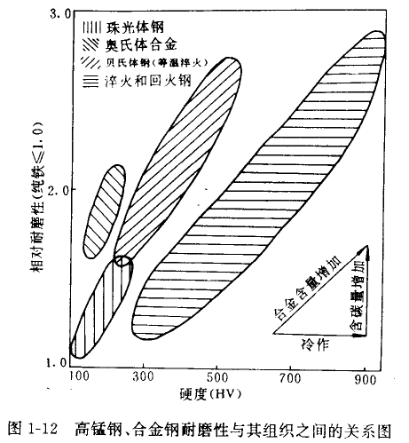 圖1-12是高錳鋼、合金鋼的耐磨性與它們組織之間的關系網。在一定的接觸應力、一定的滑動磨料磨損試驗條件下,具有較高含碳 量的回火馬氏體鋼能獲得較高的耐磨性;相同硬度條件下,貝氏體的耐磨性又比回火馬氏體的耐磨性高。這時的高錳鋼只相當于回火馬 氏體和貝氏體鋼的中等耐潛水平;珠光體的硬度最低,耐磨性最差,相同距度的田氏體與珠光體組織相比,奧氏體的耐磨性又高得多。 殘余奧氏體對鋼的耐磨世也是有影響的。很多學者認為,在馬氏體一碳化物的混合組織中存在者殘余奧氏體.對提高抗廟料磨損性能是 有益的。殘余奧氏體在其中起的作用一般認為是: