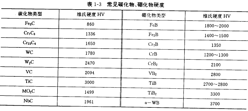 在碳化物中,M3C型結構的硬度較低,對耐磨性貢獻小,馬氏體和合金工具鋼中碳化物多屬于M3C型結構。高鉻鑄鐵中碳化物主要是 (FeCr)C3型碳化物,也有少量的(FeCr)6C、(FeCr)23C6型碳化物,他們的硬度均較M3C型為高,對耐磨性貢獻也大。在硬質合金 中的碳化物大多是WC、TiC、ZrC、Nh、VC等。它們都具有極高的硬度和高溫穩定性,是硬質合金具有高的耐湃性利紅硬件的土要原因。 此外,很多合金元素還可與B生成Fe2B、TiB,CrB等同硬度的刪化物,對材料的耐磨性也具有較大的影響。常見的碳化物、硼化物硬度 見表1-3。