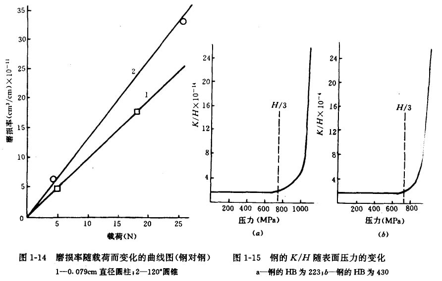 粘著磨損率在一定范圍內與載荷成正比。圖1-14表示鋼與鋼聯擦時磨損串與載荷之間的關系。超過此范圍加載就得到圖1-15a、b的結果。圖中表示不同硬度鋼的粘著磨損系數與硬度比值所丹和壓應力間的關系。當表面壓應力小于H/3(H為鋼的硬度)時,K值不變,即磨損量與裁荷成正比,當超過此臨界值后,K值急劇上升.磨損量也急劇增大。實際上,在高載荷下會發生大面積焊合與咬死。