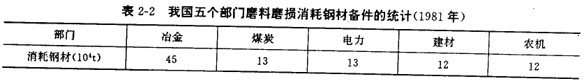 礦山機(jī)械,包括冶金礦山機(jī)械、煤礦機(jī)械、各類工程機(jī)械、建材機(jī)械、部分電力機(jī)械、農(nóng)業(yè)機(jī)械等所有機(jī)械中磨耗最嚴(yán)重的機(jī)械,也是設(shè)備備件消耗最多的部門。據(jù)1987年不完全統(tǒng)計,上述部門備件耗費(fèi)鋼材近百萬噸(見表2-2),耗費(fèi)資金幾十億元。下面我們僅以冶金礦山及煤炭礦山為例,看看礦山機(jī)械磨損失效的嚴(yán)重性。