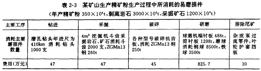 某生產(chǎn)鏡鐵礦粉的礦山,其年產(chǎn)精礦粉350萬噸,為此需剝離巖石3000萬噸,采掘礦石1200萬噸。五種工序每年平均消耗備件列于表2-3。