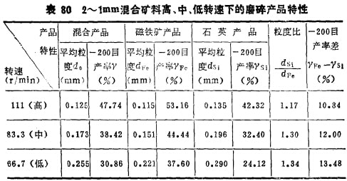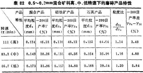 當(dāng)磨機(jī)結(jié)構(gòu)參數(shù)一定時(shí),磨機(jī)內(nèi)鋼球的運(yùn)動(dòng)狀態(tài)將完全取決于磨機(jī)的轉(zhuǎn)速及介質(zhì)的充填率;而當(dāng)介質(zhì)充填率一定時(shí),在一定范圍內(nèi)隨著轉(zhuǎn)速的增加鋼球上升高度增大,鋼球的打擊力增強(qiáng),同時(shí),鋼球的相對(duì)運(yùn)動(dòng)速度也增大。破碎力大,破碎效率提高,但破碎的選擇性降低。為了說(shuō)明轉(zhuǎn)速的影響,現(xiàn)選用2~lmm、1~0.5mm和0.5~0.3mm三組不同粒級(jí)的磁鐵礦與石英混合物(各占50%)作髙、中、低三種轉(zhuǎn)速的磨碎考查,結(jié)果列于表80~82。三種轉(zhuǎn)速是:一種為超臨界轉(zhuǎn)速(lllr/min,試驗(yàn)?zāi)C(jī)臨界轉(zhuǎn)速為l00r/min);中等轉(zhuǎn)速為"最適宜的轉(zhuǎn)速"(83.3r/min);低轉(zhuǎn)速為轉(zhuǎn)速率76%以下(66.7r/min)。