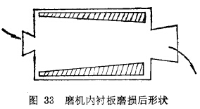磨機(jī)給礦端的礦塊大,鋼球磨損厲害,襯板自然也磨損嚴(yán)重,長(zhǎng)期磨損的結(jié)果將形成襯板的軸向坡度,使給礦端的襯板薄,排礦瑞的襯板厚,如圖33所示。這種坡度的存在又阻礙了給礦端小球向排礦端的移動(dòng)。此外,在球磨機(jī)內(nèi)鋼球 還發(fā)生徑向離析:即大球偏向內(nèi)層,小球集中到外層。而處于內(nèi)層的大球由于礦漿流向排曠端所發(fā)生的沖力也難于向給礦端移動(dòng)。磨機(jī)內(nèi)鋼球的不合理分布,若采用"分級(jí)襯板"則可改變這種狀況,分級(jí)襯板沿磨機(jī)軸向呈螺旋分布, 所以隨著筒體的轉(zhuǎn)動(dòng)能將處于外層的小鋼球推向排礦端,而處于中心部分的大球也就滾向給礦端,結(jié)果使給礦端分布大球,排礦端分布小球。球的分布趨于合理,破碎力趨于精確,磨碎作用的選擇性自然也隨之提髙,這不僅能降低物 料的過(guò)粉碎,提高解離的選擇性,而且可使磨機(jī)的生產(chǎn)能力提髙10~15%。目前興起的角螺旋襯板,除能對(duì)介質(zhì)起一定分級(jí)作用外,還能使物料與介質(zhì)充分拌合,有利于磨碎作用,因此盡管安裝角螺旋襯板后磨機(jī)容積有所降低,但磨機(jī) 的生產(chǎn)率仍提髙10~15%,電耗也有所下降。可見(jiàn),分級(jí)襯板的形式是可取的。