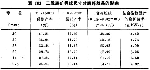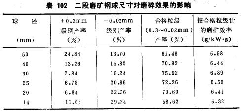 例如,用云錫公司卡房采選廠二段磨礦及三段磨礦給礦,通過試驗方法確定它們的最適宜球徑:二段磨給曠的最大粒度1.2mm,要求的磨礦粒度0.3mm;三段磨給礦最大粒度0.7mm, 規(guī)定的磨礦粒度0.15mm;產(chǎn)品中-0.02mm級別算為過粉碎級表102及表103的試驗結(jié)果說明: