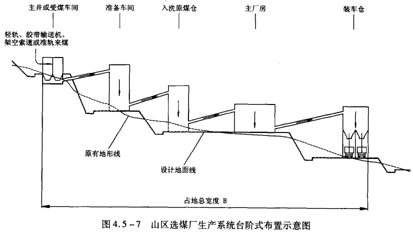 場地的地形、平面形狀、面積、水文、工程地質、氣象條件對工藝系統的布置影響極大。例如,在工程地質條件較好的平坦地區,工藝系統布置的限制較小,而在丘陵或山區,則牽制很大。總布置設計中必須注意到選煤廠工藝系統中幾個主要車間的平距與垂高的上下起落關系,恰當地利用地形,既不要不顧具體自然條件,完全按固有概念去生搬硬套搞布置,也應避免布置僅僅是單純地去遷就自然條件。前者必然造成工程、經濟的不合理,并使總平面公式化;后者則會在生產上帶來隱患,并使總平面布置雜亂無章。選煤廠幾個主要車間一般應按順序由高向低布置。當地形坡度較大時,工業場地往往呈臺階式布置,利用山坡自然落差,縮小房屋間距,從而減少占地面積和土石方工程量。山坡地布置生產系統的常見形式見圖4.5-7。