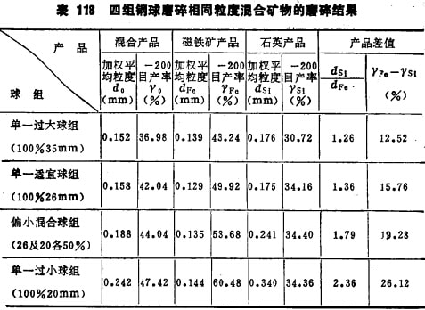 采用2~lmm的石英及2~lmm的磁鐵礦各占50%的混合礦料進行磨碎,在磨碎前先用試驗方法確定2~lmm石英及磁鐵礦所需的最適宜球徑(表117)。