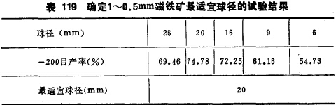 采用2~lmm石英50%及1~0.5mm磁鐵礦50%的混合礦料進行磨碎,在磨碎前先按試驗方法確定1~0.5mm磁鐵礦所需要的最適宜球徑,試驗結果列于表119。