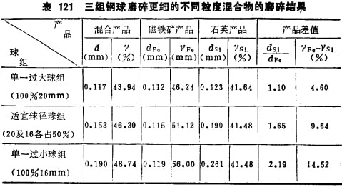 按照前面的試驗研究方法,在磨碎混合礦料前,先用單級別純礦物進行試驗,確定1~0.5mm石英最適宜的球徑為20mm, 0.5~0.3mm磁鐵礦最適宜的球徑為16mm。因此,對此混合礦料而言,最適宜的球徑配比為20mm球及16mm球各占50%;100%20tnm球即為過大球組;100%的16mm球組即為過小球組。三組球的磨礦條件相同,磨碎試驗的結果列于表121所示。