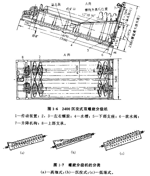 螺旋分級機的分類按槽內螺旋的數目可分為單螺旋分級機和雙螺旋分級機,按分級面的高低可分為高堰式、低堰式和沉沒式3種螺旋分級機(見圖1-7)。