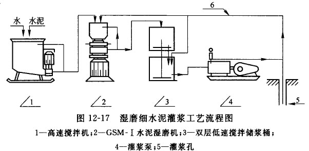GSM-I型高效水泥濕磨機細磨水泥灌漿工藝,其流程圖如圖12-17所示。