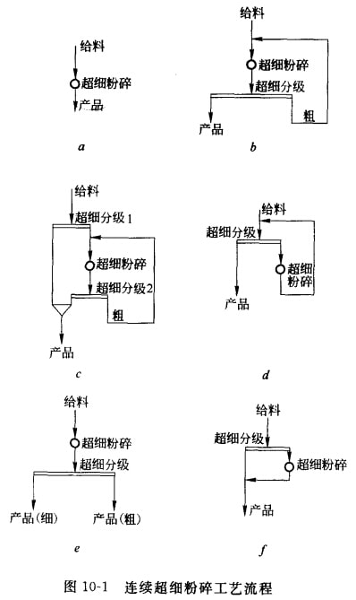 連續(xù)系統(tǒng)分為開路和閉路系統(tǒng),其主要區(qū)別在于其是否有分級機配套形成閉路。圖10-1所示為各種連續(xù)超細(xì)粉碎工藝流程。