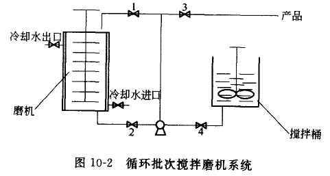 在濕式批次粉磨系統(tǒng)中,為避免泥漿粉磨時熱量的聚集、粉碎環(huán)境的惡化,可采用循環(huán)式批次系統(tǒng)。即泥漿泵將研磨中的泥漿泵出,經(jīng)冷卻器冷卻冉泵入磨機內(nèi),使磨機內(nèi)溫度降低,且強化了研磨中物料的混合,提高了產(chǎn)品粒度分布的均勻性。循環(huán)批次攪拌磨機如圖10-2所示。