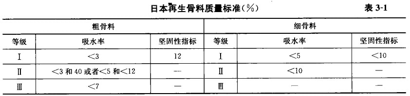 再生混凝土骨料多數(shù)參考普通混凝土骨料的分類(lèi)方法進(jìn)行分類(lèi)。在我國(guó),研究者多根據(jù)《普通混凝土用砂、石質(zhì)量及檢驗(yàn)方法標(biāo)準(zhǔn)》(JGJ52-2006),將粒徑在0.16-5.00mm之間的再生月料稱(chēng)再生細(xì)骨料,粒徑大于5mm的稱(chēng)再生粗骨料。也有學(xué)者考慮到再生細(xì)骨料小含有細(xì)小水泥漿顆粒,將再生細(xì)骨料的粒徑范圍定為0.08-5.00mm。日本于1994年4月頒布了《再生混凝土材料質(zhì)量試行條例》,給出了再生骨料、再生基層材料、填充材料的質(zhì)量標(biāo)準(zhǔn),并劃分了再生骨料的質(zhì)量等級(jí),如表3-1所示,表中堅(jiān)固性指標(biāo)與我國(guó)壓碎指標(biāo)意義相同。