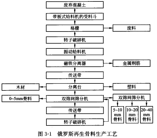 目前再生骨料的生產(chǎn)丁藝大都是將切割破碎設(shè)備、傳送機(jī)械、篩分設(shè)備和清除雜質(zhì)設(shè)備有機(jī)結(jié)合,完成破碎、去雜、分級(jí)等工序。不同設(shè)汁者和生產(chǎn)廠(chǎng)家只在生產(chǎn)細(xì)節(jié)上稍有不同。圖3-1是當(dāng)前俄羅斯具有代表性的再生混凝土骨料生產(chǎn)工藝。日本具有代表性的再生骨料的生產(chǎn)過(guò)程包括三個(gè)階段:(1)預(yù)處理階段:除去廢棄混凝土中的其他雜質(zhì),用顎式破碎機(jī)將混凝土塊破碎成40mm直徑的顆粒;(2)碾磨階段:將混凝土塊故人旋轉(zhuǎn)的偏心筒中,相互碰撞、摩擦,除去附著于骨料表面的硬化水泥漿。(3)篩分階段;將碾磨后的顆粒篩分,除去水泥和砂漿等細(xì)小顆粒,最后得到的即為高性能再生骨料。再生骨料的生產(chǎn)過(guò)程中,廢棄混凝土塊在破碎機(jī)械中不斷受到?jīng)_撞、擠壓、研磨,損傷積累,再生骨料內(nèi)部產(chǎn)生大量微裂紋,混凝土塊中天然骨料和水泥漿體的原始界面受到破壞,粘結(jié)力下降。因此骨料包裹的硬化水泥漿越少,再生骨料性能就越高。但一般的生產(chǎn)工藝生產(chǎn)的再生骨料與天然骨料相比含有30%左有的硬化水泥漿。可見(jiàn),生產(chǎn)工藝對(duì)再生骨料的影響不容忽視。此外,資料還表明:再生骨料經(jīng)水沖洗后對(duì)提高再生骨料性能非常有利。