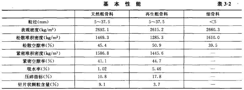 從表3-2可見,再生粗骨料中針片狀顆粒含量為3.7%,天然粗月料的針片狀顆粒含量為9.1%。骨料中的針片狀顆粒不僅本身受力時易折斷,而且含量較多時會增大骨料的空隙率,使混凝土拌羽吻和易性變差,同時降低混凝土強皮。因此,單就針片狀顆粒含量來說,再生粗骨料優于天然粗骨料。