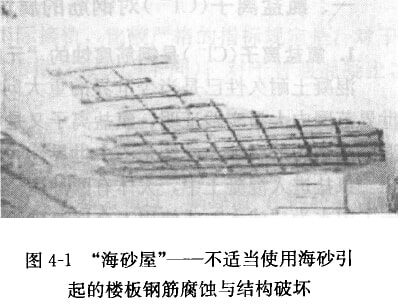 我國大規模經濟建設的飛速發展,使沿海地區陸續出現河砂短缺現象。我國沿海地區愉挖、濫用海砂現象出來已久,1999年同土資源部發布了《關于加強海砂開采管理的通知》,提出在保護海洋環境的前提下,允許有序地開發海砂資源,以解決建筑用砂問題。這本是“變廢為寶”的好事,然而,不合理地使用海砂,卻會給國家和民眾帶來麻煩乃至災難。這是因為海砂中含鹽,會腐蝕鋼筋、破壞混凝土結構。如果使用不合格海砂,建筑物就會發生結構破壞甚至跨塌(一般可在1-15年內暴露出來)。一旦遭遇地震,這樣的建筑物可能最先倒塌。所謂“海砂屋”就是指使用了不合格海砂所建造的建筑物(公用、民用或基礎設施),是屬于質量低劣的建筑(圖4-1)。