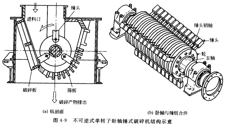 錘式破碎機包括臥軸錘式破碎機和立軸錘式破碎機兩種,常見的是臥軸錘式破碎機,即水平錘式破碎機。水平軸由兩端的軸承支持,原料借助重力或用輸送機送入。轉于下方裝有篦條篩,篦條縫隙的大小決定破碎后的顆粒的大小。圖4-9所不為不可逆式單轉子臥軸錘式破碎機結構示意。