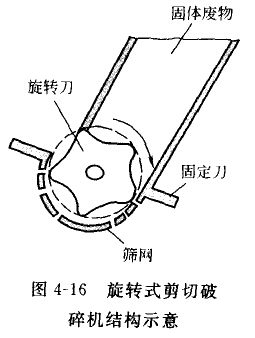 圖4-16所示為旋轉式剪切破碎機結構示意。它內固定刃(1-2片)和旋轉刃(3-5片)組成。固體廢物給人料斗,依靠高速轉動的旋轉刃和固定刃之間的間隙擠壓和剪切破碎,破碎產品經篩縫排出機外。該機的缺點是當混人硬度較大的雜物時,易發生操作事故。這種破碎機適合家庭生活垃圾的破碎。