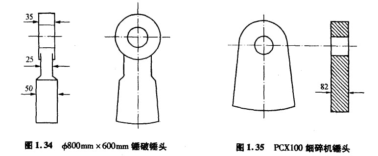 例如,老型號錘式破碎機錘頭的結構形狀如圖1.34,立軸式破碎機錘頭也類似。當初設計思想是盡可能減輕非磨損部位(錘柄)的重量,節約材料,降低成本。所以,錘柄部位很薄,只有采用高錳鋼或低碳合貧鋼材質才能保證其不斷裂,但耐磨性很差,無法用于熟料的破碎。用高硬度耐磨材料制作該錘頭,很容易斷裂,無法可靠應用。