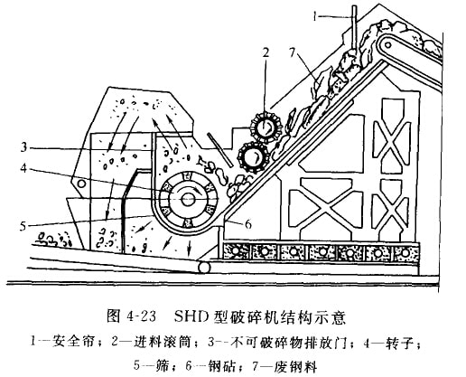 SHD型廢鋼破碎機結構如圖4-23所示,功率與生產能力如表4-5所示。