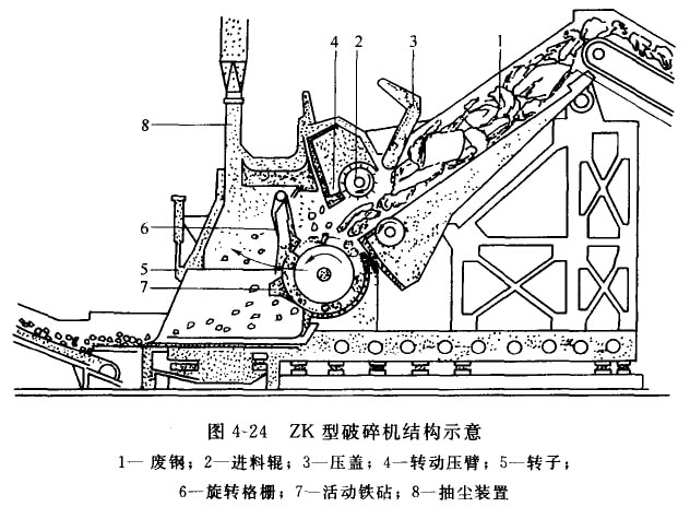 左下方設有活動鐵砧,可以調節轉于錘頭勺砧之間的間隙,從而獲得預期尺寸的破碎鋼片。旋轉格柵起到篩和不可破碎物排放門的雙重作用。③轉于的旋轉方向嶼供料方向一致,物料進入破碎機后,首先是保持在破碎腔上方。可破碎物進入轉子與砧之間后被擊破撕裂成小塊,不可破碎物(重型廢鋼)將在轉于的驅動廠撞向活動格柵,使其向后轉動,從而離開了破碎機。這是ZK型破碎機的最大特點。ZK型破碎機結構如圖4-24所示,其功率與生產能力如表4-6所示。