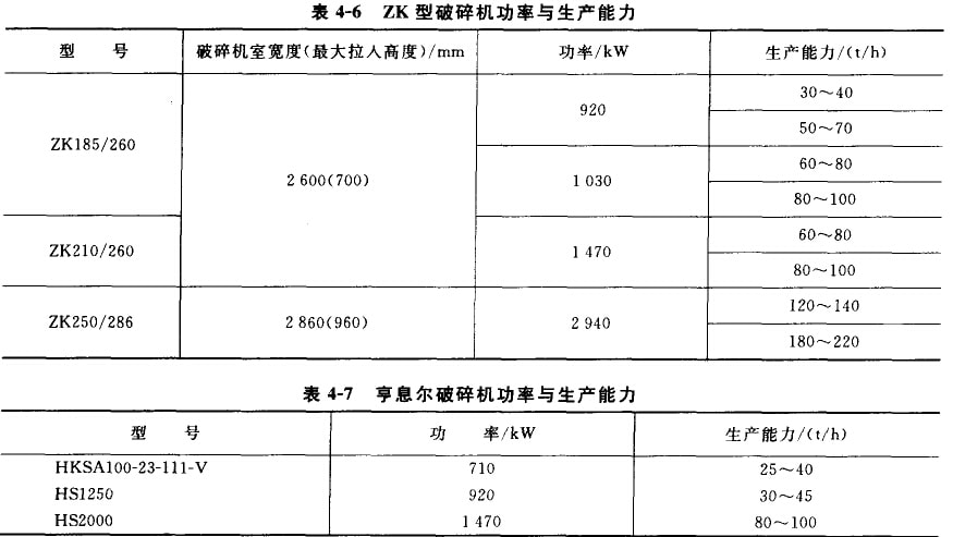 立式破碎機世界上使用較少,90%以上的用廣都選用臥式。亨息爾公司的臥式破碎機與美國紐維爾公司的產品相似,這里不再贅述,其功率與作產能力見表4-7。