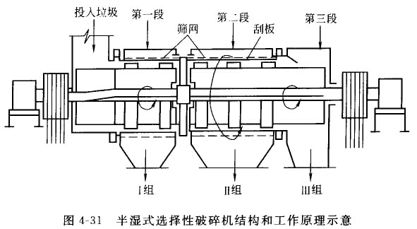 圖4-31是半濕式選擇性破碎機結構和上作原理示意。