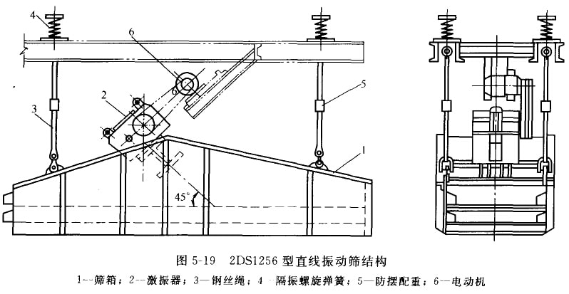 DS系列直線振動篩為吊掛式振動篩。海篩分機合中層篩面和雙層篩面兩種。圖5-19是2tDS1256型直線振動篩結構。它由雙層篩而的篩箱1、激振器2和械拄裝置組成。吊技裝置包括鋼絲繩3、隔振螺旋彈簧4和防擺配重5。傾斜裝設的激振器內電動機6通過皮帶傳動系統帶動,產生與篩面成45°的激振力。篩箱在激振力的作用下,做拋射角為帖。的往復直線運動。被篩物料從給料端加入,在篩面上跳躍的前進;篩下產物自下部排出,收集在篩下漏斗中;篩上產物從排料端排出。