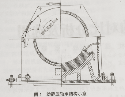 最初磨機規格較小時,基本上都是用此類主軸承。其工作原理是,磨機還沒運轉時,先啟動潤滑站的高壓泵,高壓油進入到主軸承的油腔中頂起中空軸,在軸承和中空軸之間形成一層油膜,當磨機筒體開始旋轉時,利用軸承的楔形油腔產生的動壓效應,在軸承和中空軸之間形成一層穩定的油膜,同時潤滑站的高壓系統停止供油,低壓系統向主軸承的頂部供 低壓油,低壓油灑在旋轉的中空軸上,對已經形成的油膜進行油量補充。動靜壓軸承的結構如圖1所示。